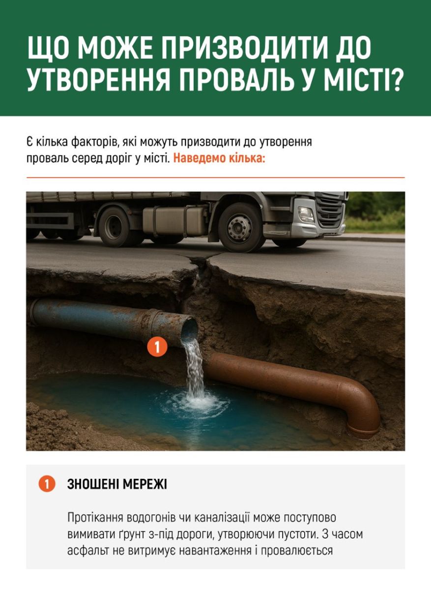 Однією з поширених причин утворення проваль є протікання підземних комунікацій – водогонів, каналізаційних або теплових мереж, що належать комунальним підприємствам переважно обласного підпорядкування. У результаті витоку відбувається поступове вимивання ґрунту з-під дорожнього полотна. Це призводить до утворення пустот, які з часом провокують просідання асфальту.