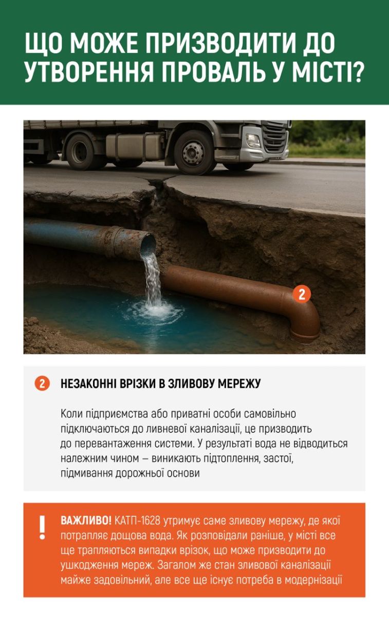Зазначимо, що переважна більшість проваль на дорогах не належать до сфери відповідальності КАТП-1628. Навіть якщо просідання утворилося безпосередньо біля зливового люка, це ще не є автоматичним підтвердженням, що причиною стала саме зливова система. У багатьох випадках джерело проблеми за кілька метрів від місця провалу, наприклад, унаслідок пориву водогонів, каналізаційних або теплових мереж, що належать комунальним підприємствам обласного підпорядкування.