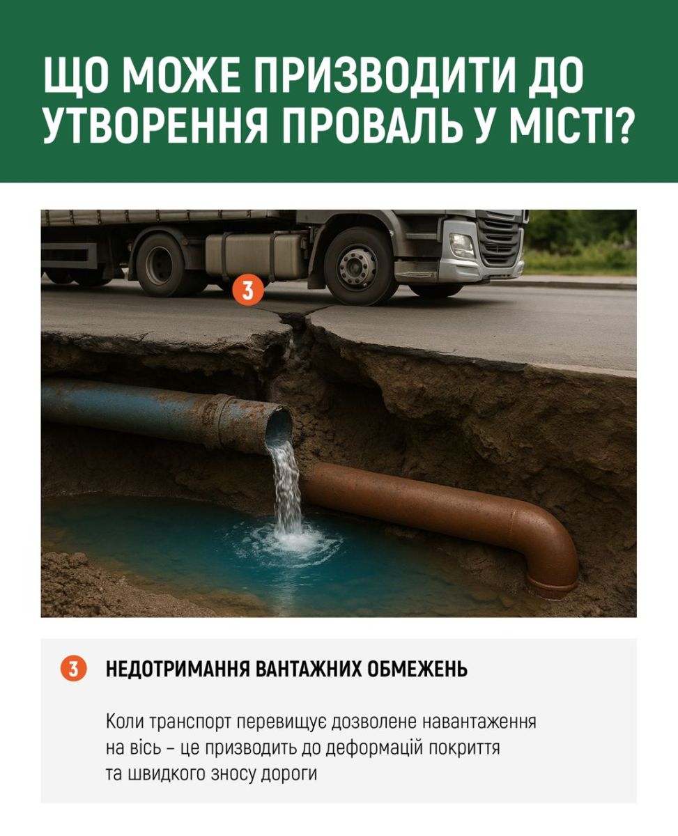 У разі виявлення провалля просимо звертатися до служби оперативного реагування 1580 за такими номерами: +38 (066) 286-58-87, +38 (067) 158-15-80.