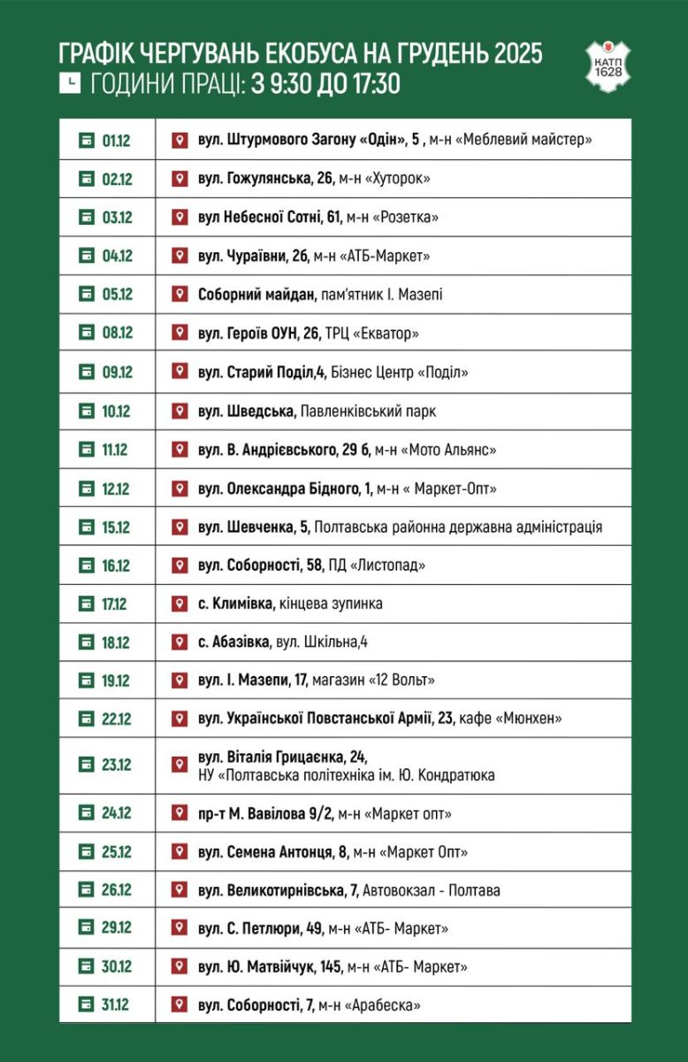 Зберігайте графік чергування екобуса в Полтаві на грудень 2025 року