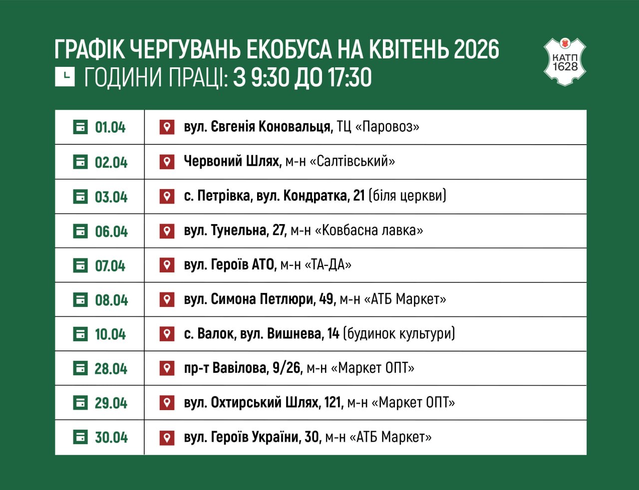 Зберігайте графік чергування екобуса в Полтаві на квітень 2026 року