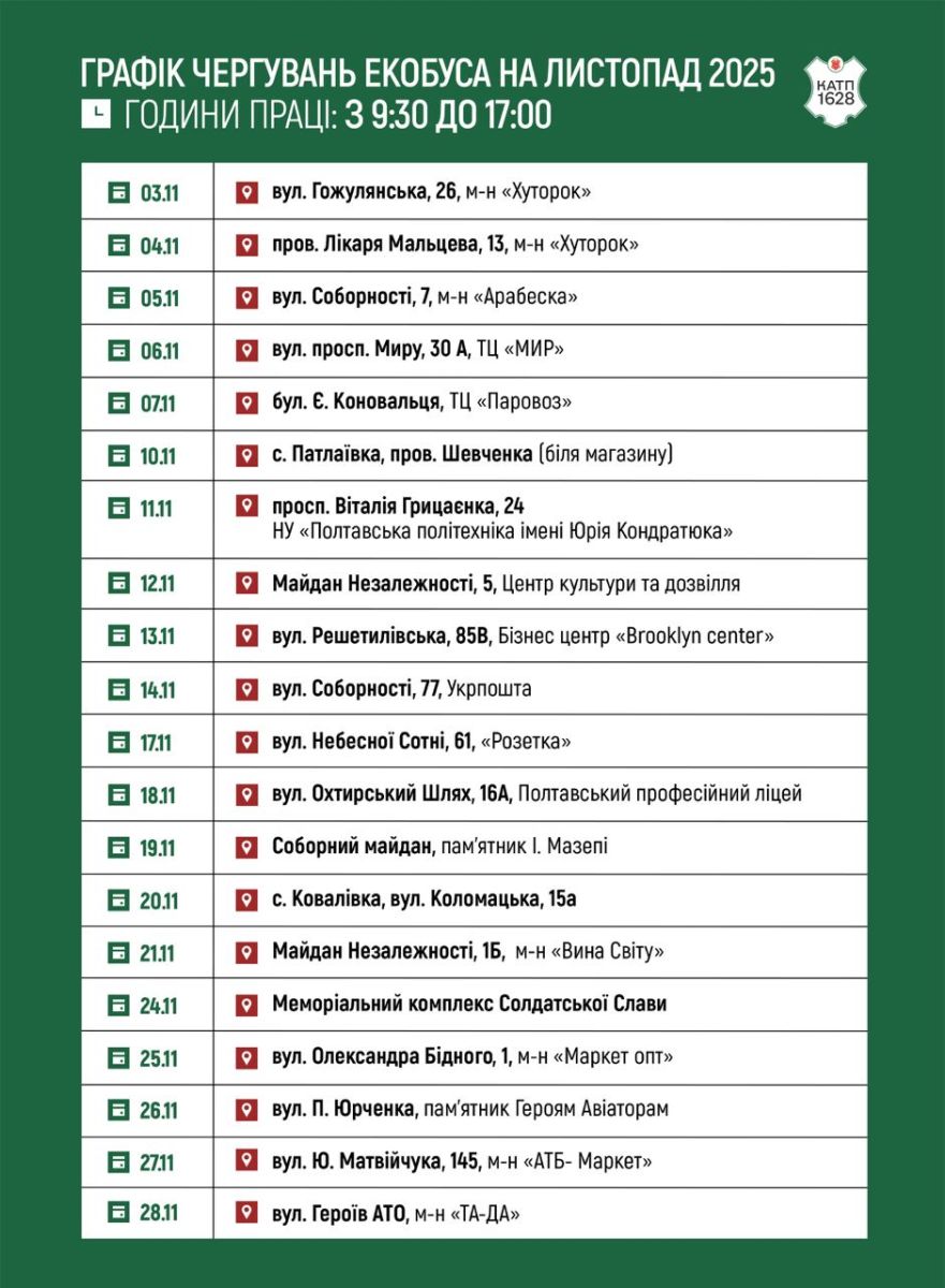 Зберігайте графік чергування екобуса в Полтаві на листопад 2025 року