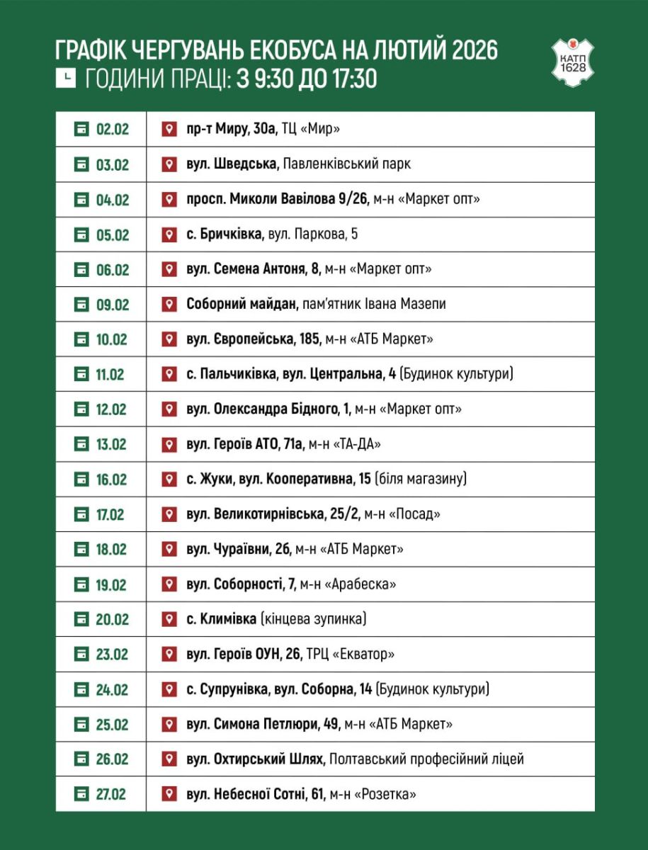Зберігайте графік чергування екобуса в Полтаві на лютий 2026 року