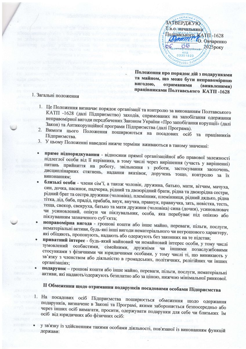 Положення про порядок дій з подарунками та майном, що може бути неправомірною вигодою